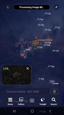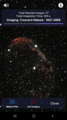 The Camera View displays a live feed from Origin’s camera. Here, you can start imaging sessions or adjust camera settings. Origin automatically stacks and processes each exposure using its built-in AI algorithms. This processing doesn’t add new data to your image but rather brings out the best in your data and reduces noise. When you’re finished, tap “End Imaging” to