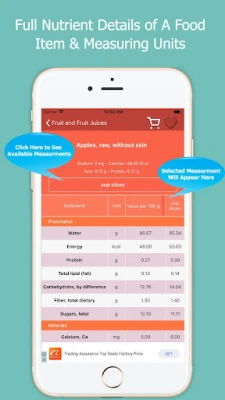 1. Select any food item on foods listing page and it will take you to the detailed view of food and it’s complete nutrients detail.